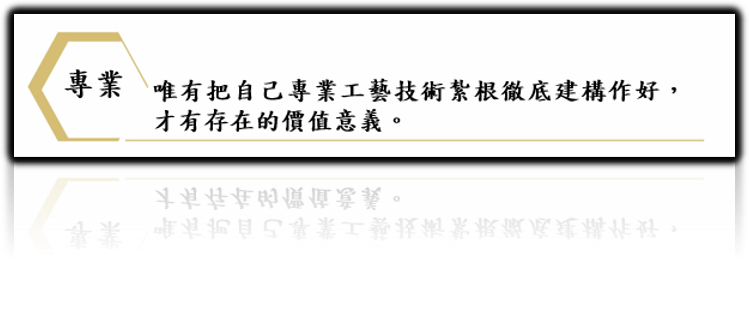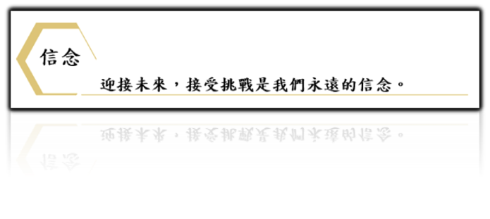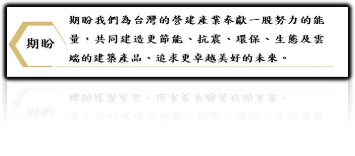 迎接未來,接受挑戰是我們永遠的信念,唯有把自己專業工藝技術扎根徹底建構作好,才有存在的價值意義,期盼我們為台灣的營建產業奉獻一股努力的能量共同建造更節能、抗震、環保生態及雲端的建築作品,追求梗卓越美好的未來。