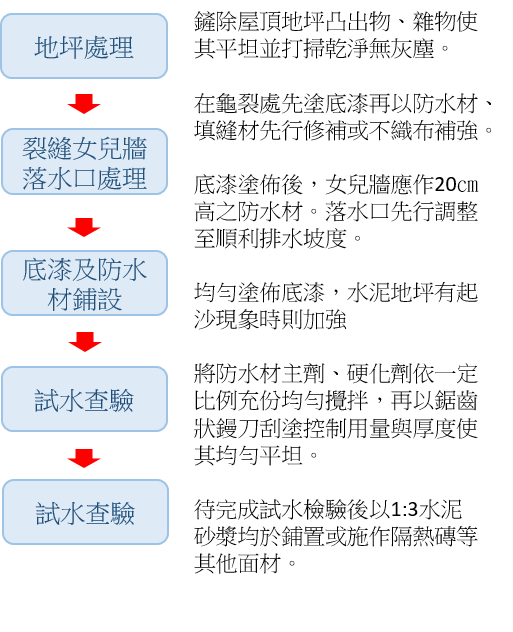 針對需施作防水工程的處所如屋頂、水景、浴室、外露樑、窗框等嚴格依規範視適用性施作PU材質或彈性水泥並試水查驗,原料方面要求施工單位使用最穩定及通過國家認證的防水材料,最大程度延長防水效果的耐用年限,堅持及保固制度是對業主最大的保障。
